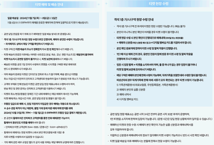 입장은 공연 시작 1시간 전부터 진행되며, 현장 상황에 따라 변동될 수 있다고 합니다.