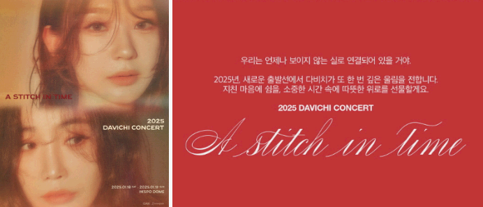 2025년 다비치 콘서트 "A Stitch in Time" 은 2025년 1월 18일과 19일 에 서울 KSPO Dome에서 개최한다 . 이 콘서트에는 이해리와 강민경 으로 구성된 듀오 다비치가 출연하며, 이 공연은 감정적 연결과 편안함이라는 주제를 강조하면서 진심 어린 편안한 음악을 선보일 것으로 기대됩니다.